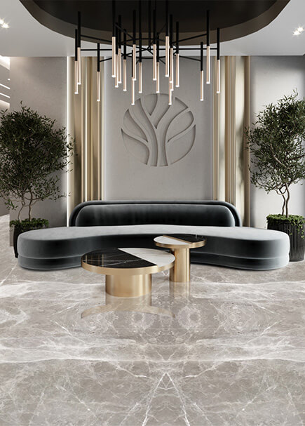 With a liberal sprinkling of grey droplets on a bed of silver fog, the Grey Sonata marble elevates the contemporary minimalist interiors to a work of art.